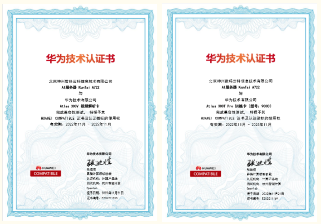近日,PT电子 - 官方网站 A722服务器通过华为“Atlas 300V 视频解析卡”以及“Atlas 300T Pro 训练卡(型号:9000)”两项技术认证,为智能算力再添新力!